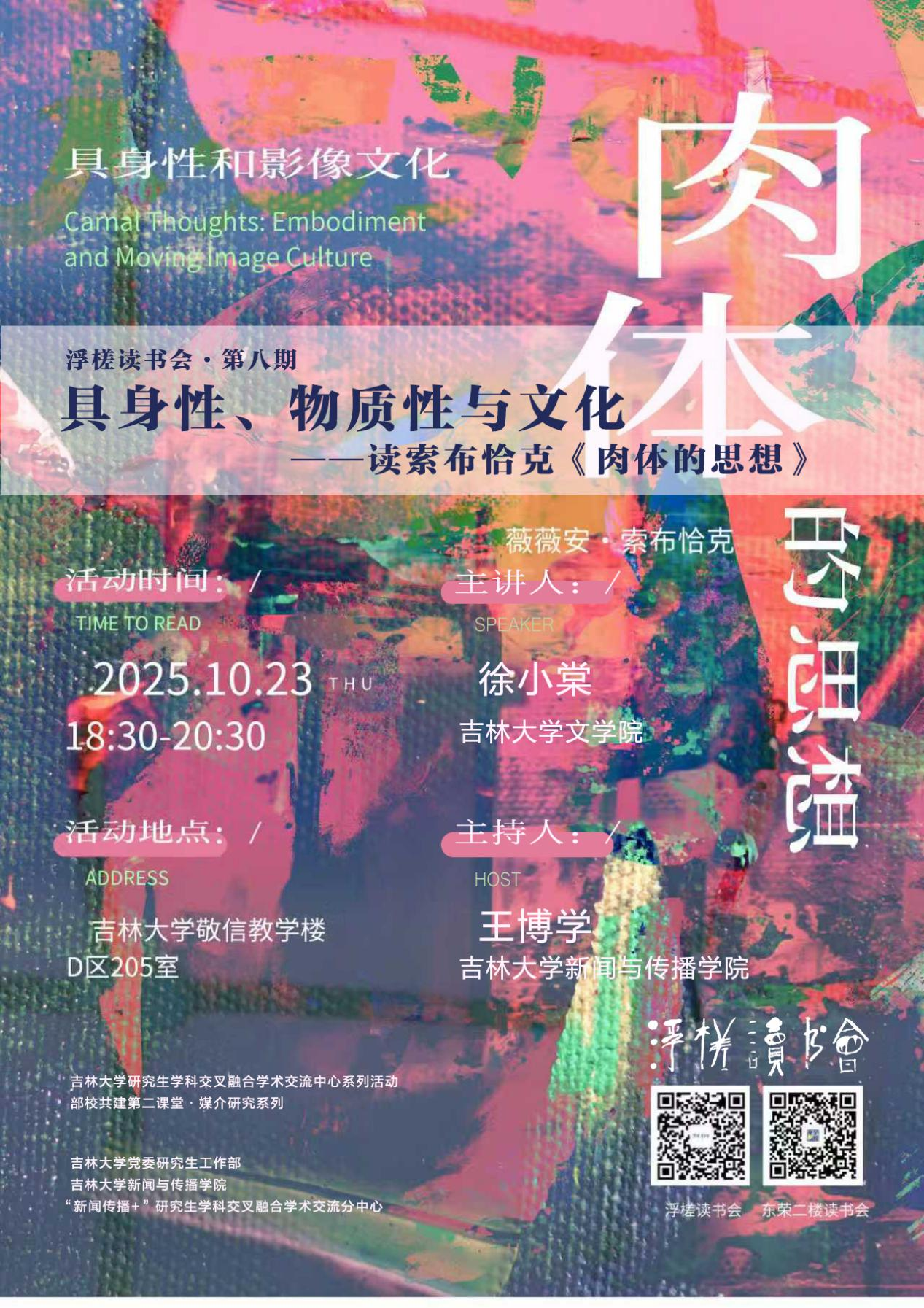文艺学教研室青年教师徐小棠博士做“具身性、物质性与文化——读索布恰克《肉体的思想》”专场主题研讨活动。具体通知内容如下: