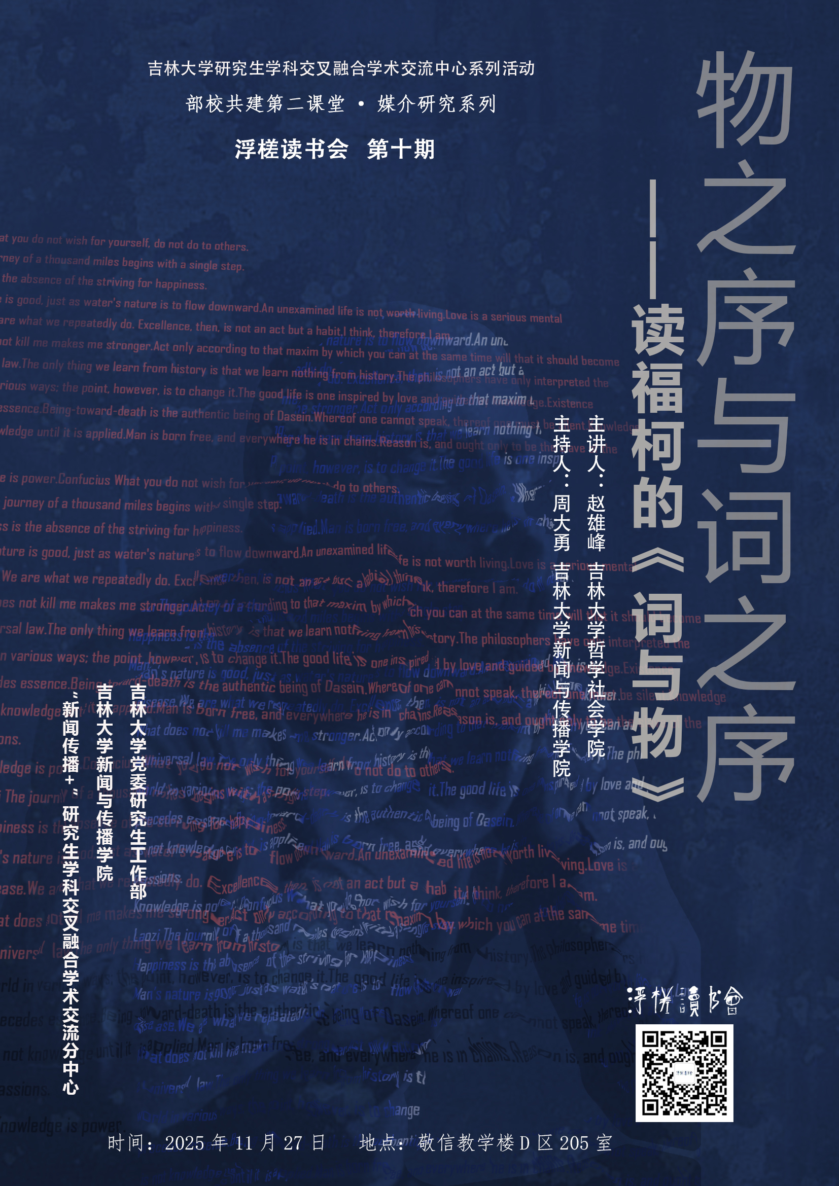 为活跃学术氛围,拓宽学科交叉融合研究视野,提升学生理论素养,特邀请吉林大学哲学社会学院赵雄峰副教授做“物之序与词之序——读福柯的《词与物》”专场主题研讨活动。具体通知内容如下: