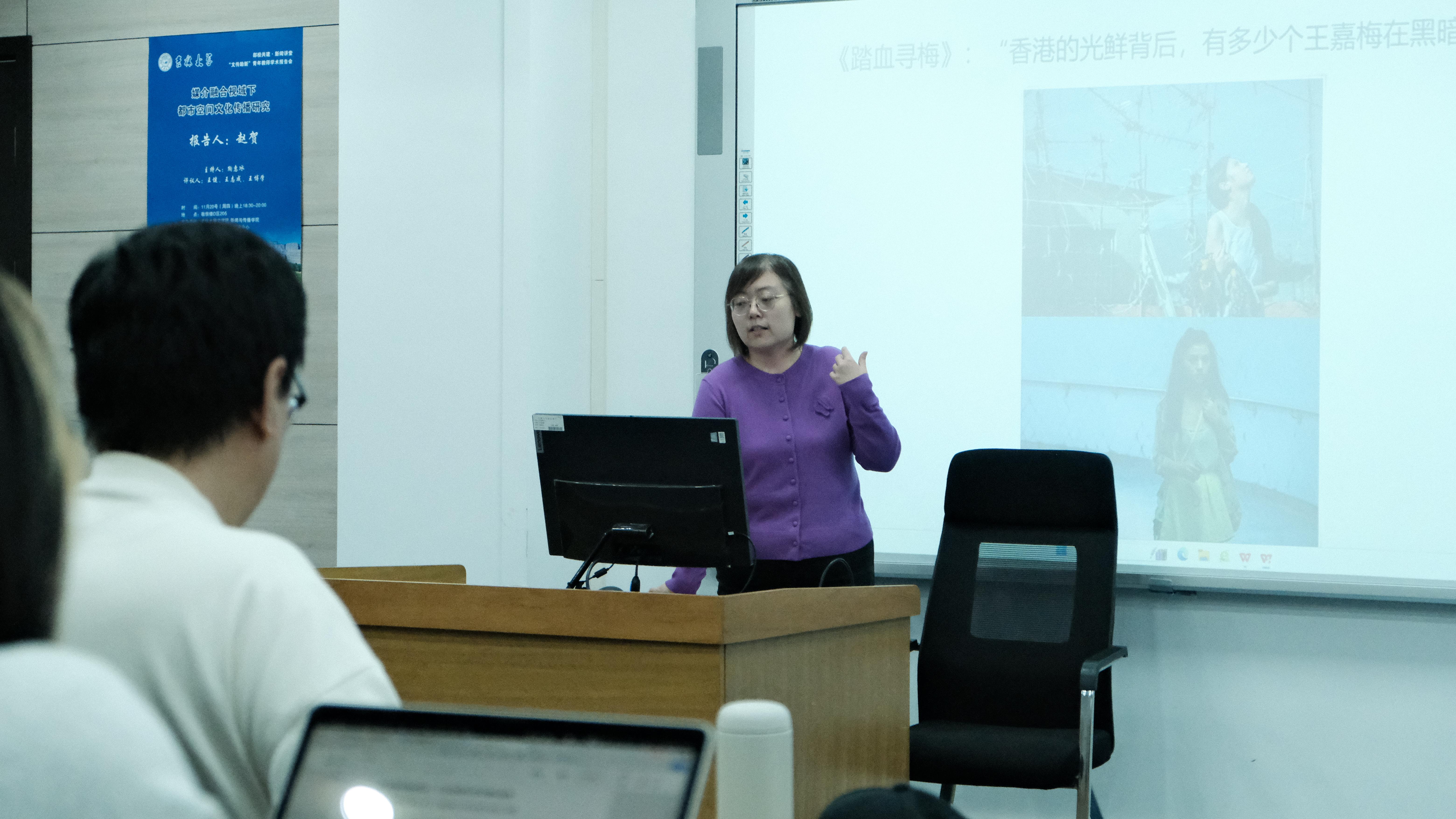 讲座伊始,赵贺老师以《踏血寻梅》为引入点,她结合影片中香港大都市的背景,深入剖析了边缘个体在钢筋水泥丛林中的生存困境。16岁内地赴港少女王佳梅的身份迷失、生活窘迫与精神空虚,以及加害者同为都市“失败者”的困境,揭示了这类悲剧的核心成因,既源于都市的冷漠氛围,更离不开量化的客观化成就标准对个体的挤压,直观呈现出大都市中个体与环境的尖锐矛盾。