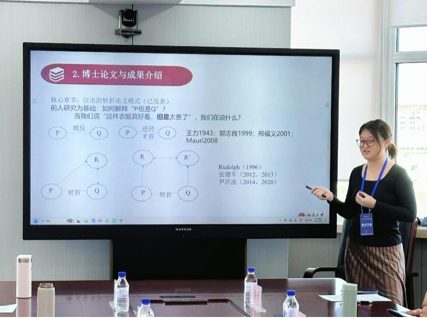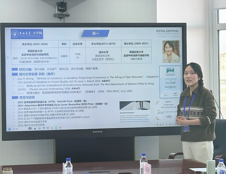 在后续的交流互动环节,与会青年学者逐一介绍了自身的研究方向、已取得的学术成果以及后续的科研规划。北京大学王婧雯博士主要介绍了其对于现代汉语转折关联词的研究成果;墨尔本大学讲师张大师着重分享了其教育教学经历以及在企业社会责任等方面的研究心得;伦敦大学皇家中央演讲与戏剧学院张一博士则以“革命叙事的文化记忆与跨媒介重构——20世纪中国左翼戏剧作品的改编研究”为题汇报了其研究方向与创作实践。相关学科参会教师代表分别与之进行了深入探讨,现场氛围热烈而融洽。