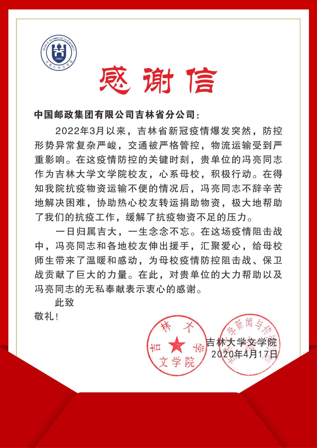 文咏大爱 传情似海——寄信中国邮政集团有限公司吉林省分公司