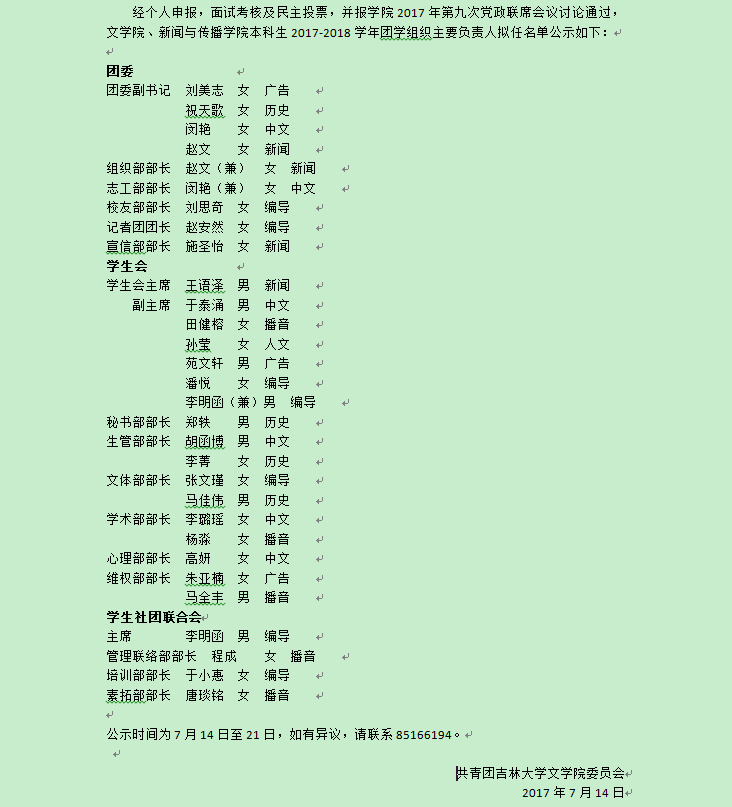 大发时时彩 、新闻与传播学院2017-2018学年本科生团学组织主要负责人拟任名单公示